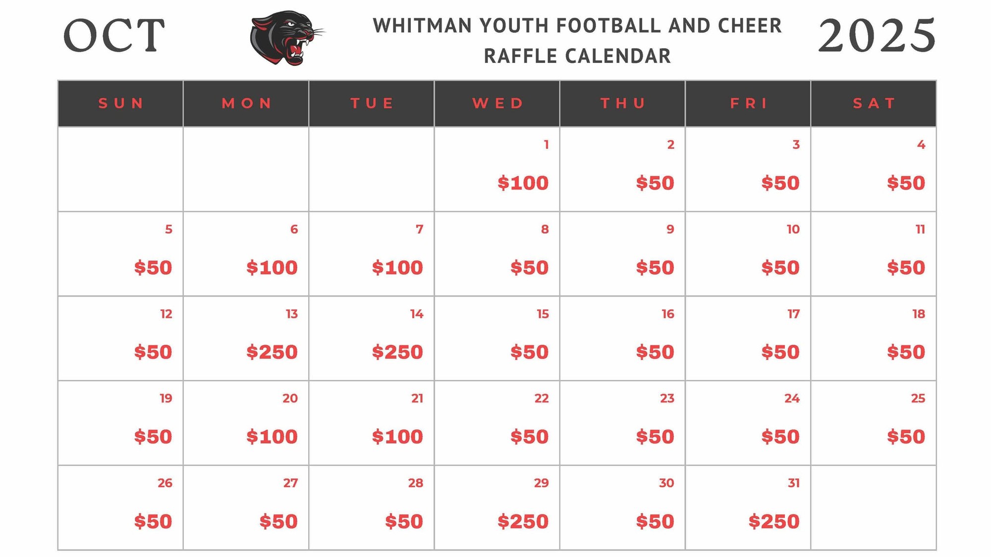 All children registered will need to sell 10 raffle calendars as a fundraiser for Whitman Youth Football and Cheer Program.